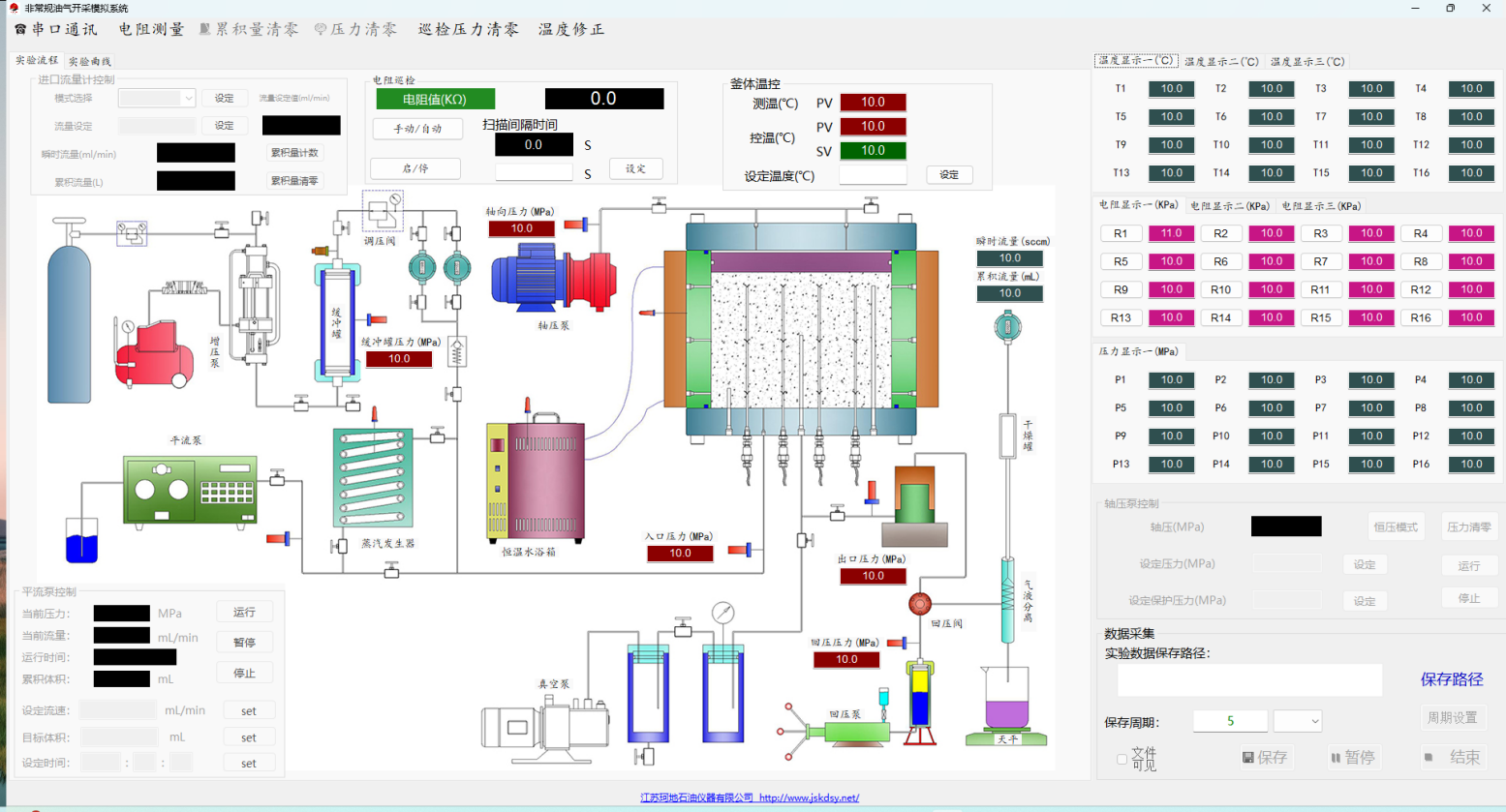 高温高压模拟测试系统:渗流压力≥90 MPa,支持恒压/恒流模式,具备数据自动采集、云图显示与Excel导出功能。