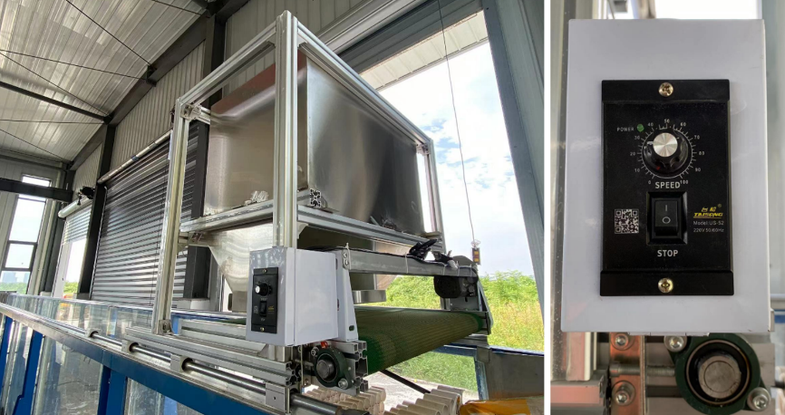 系统搭载在轨道上,由步进电机控制,无级变速调节,容积为400L;加沙率0-50kg/min可调。