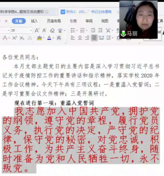 活动第二阶段为支部主题党日活动。由于科级干部调整,原来机关党支部组织委员王宁调出地科学院,重新推举郭霖同志为组织委员。各位党员自觉交纳了4月党费,并在马书记带领下,全体党员利用屏幕共享和手机语音重温了入党誓词,这也是疫情防控工作中一次特别的党员宣誓。紧接着,大家集中学习重要会议文件精神:3月4日中共中央政治局常务委员会会议精神、3月6日决战决胜脱贫攻坚座谈会精神、习近平在湖北省考察新冠肺炎疫情防控工作时的讲话精神、3月18日中共中央政治局常务委员会会议精神、3月27日中共中央政治局会议精神和学校2020年工作会议精神。随后,马书记传达了学院4月份中心组学习及党委扩大会议精神,主要通报了2020年我院的重点工作,对近期的重点工作进行提醒。活动最后,大家还围绕“结合疫情防控谈共产党员如何在学校双一流建设中发挥作用”开展研讨。每位机关人员都结合自己的实际从疫情防控、日常工作、学科和学院发展3个方面进行讨论,并达成一致工作态度:保安全、抓落实、谋发展。