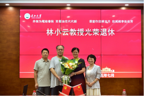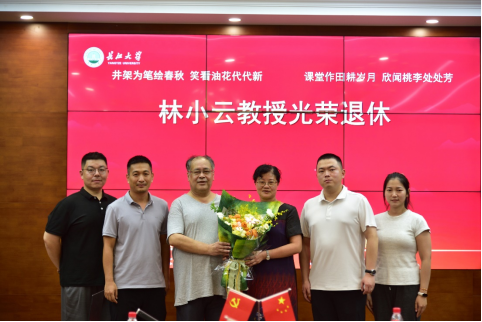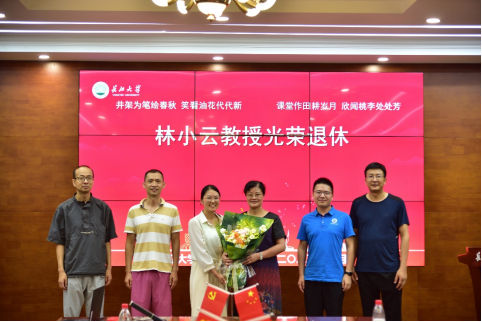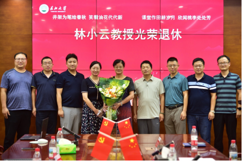 学院副院长胡忠贵代表学院向林小云教授颁发了承载着全体师生敬意与祝福的荣休纪念牌。副院长、工会主席李功权代表学院工会献上了鲜花,表达对她退休生活的美好祝愿。