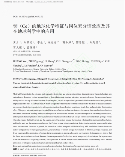 (通讯员 陈思钰)近日,yl7703永利集团21级本科生(现在读大四)黄月在中文核心(EI)期刊《地学前缘》上发表了题为《铈(Ce)的地球化学特征与同位素分馏效应及其在地球科学中的应用》的论文(共24页)。本科生黄月为论文第一作者,其导师朱光有教授为通讯作者,该论文还有四位本科生作者。论文分析了铈(Ce)及其同位素的地球化学行为、富集机制、同位素分馏效应及控制因素;梳理了其在地质测年、示踪物质来源与氧化还原环境中的应用。