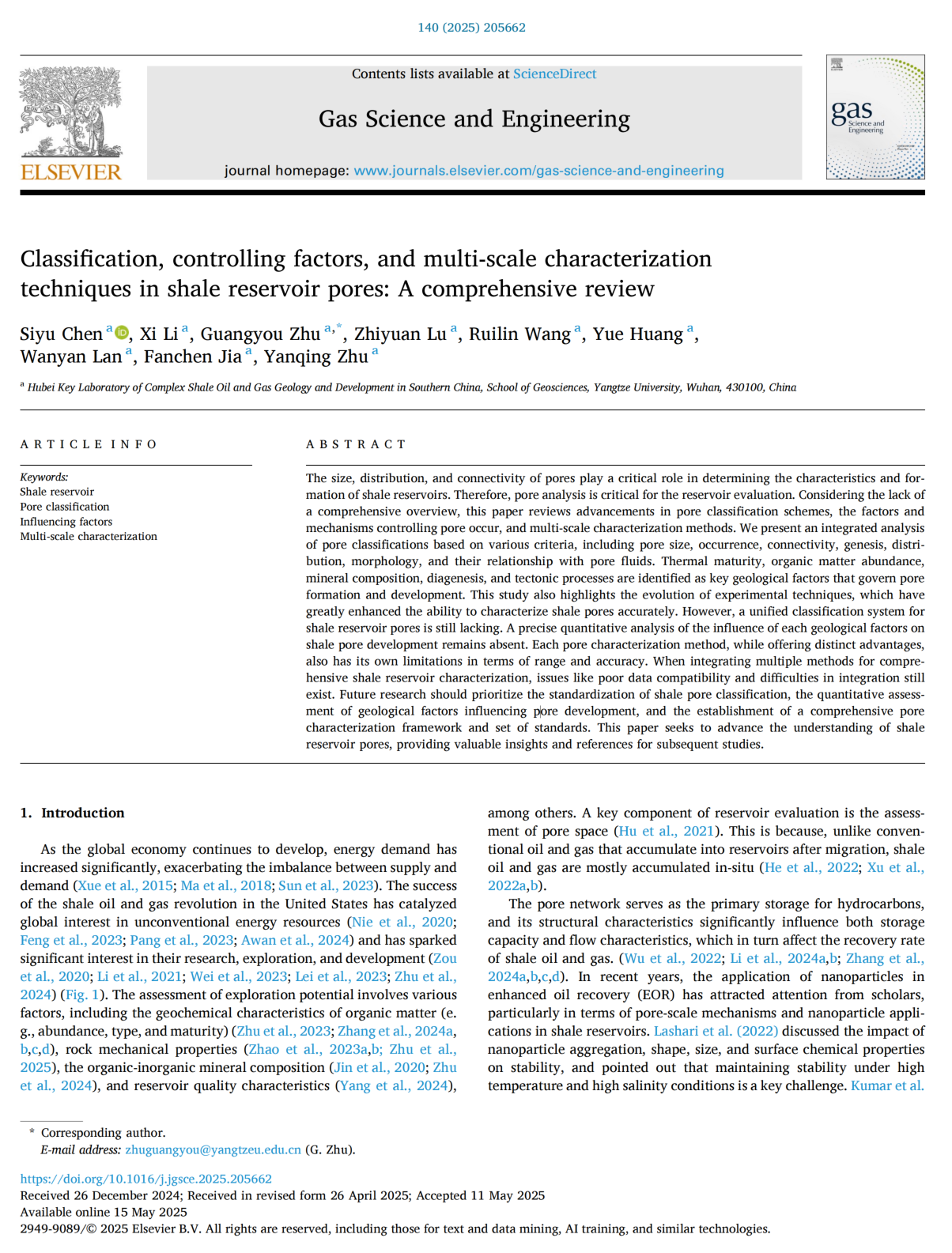 (通讯员 黄月)近日,yl7703永利集团21级本科生(现在读大四)陈思钰在《Gas Science and Engineering》(GSE,原名Journal of Natural Gas Science and Engineering,天然气科学与工程,最新影响因子为5.285,位列JCR分区一区,中科院期刊分区工程技术大类二区)上发表了题为《Classification, Controlling Factors, and Multi-Scale Characterization Techniques in Shale Reservoir Pores: A Comprehensive Review》的论文(共18页)。全部作者均来自yl7703永利集团,本科生陈思钰为论文第一作者,其导师朱光有教授为通讯作者。该论文分析了页岩储层孔隙的分类、控制因素及多尺度表征方法,为页岩储层孔隙进一步研究以及优化勘探开发策略、提高油气采收率提供了参考。
