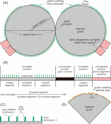 (1)粘土膜降低被包裹碎屑颗粒表面积的机理:作者通过几何方法定量计算了碎屑颗粒表面积降低与粘土膜属性参数间的关系,包括包裹率、粘土板片晶体厚度和粘土板片晶体间隙宽度(图2),且其与包裹率间呈抛物线关系,而非负相关线性关系。