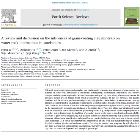 论文信息:Huan Li*, Qinhong Hu*, Stuart Jones, Jon Gluyas, Eric O. Ansah, Saju Menacherry, Qiqi Wang, Tao Ye, 2025. A review and discussion on the influences of grain-coating clay minerals on water-rock interactions in sandstones. Earth-Science Reviews 263, 105073.https://doi.org/10.1016/j.earscirev.2025.105073.
