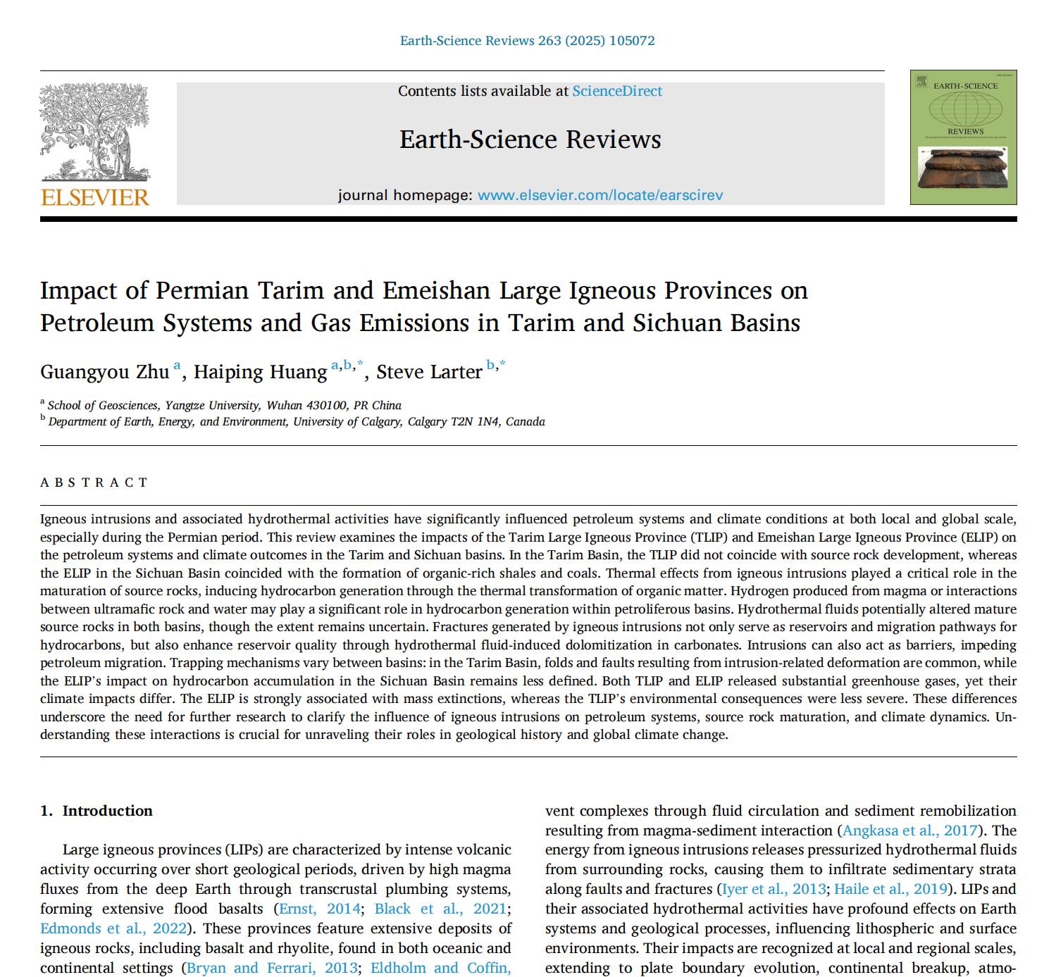 (通讯员:卢志远)近日,yl7703永利集团朱光有和黄海平教授在中科院一区TOP期刊《Earth-Science Reviews》(IF=10.8)发表题为“Impact of Permian Tarim and Emeishan Large Igneous Provinces on Petroleum Systems and Gas Emissions in Tarim and Sichuan Basins”的论文。