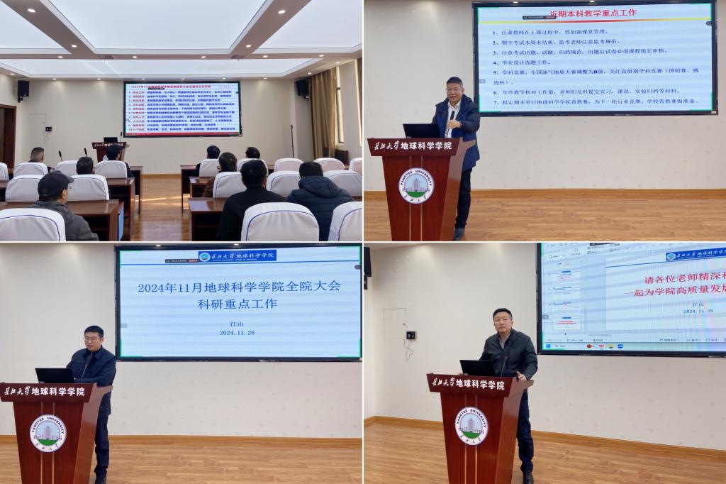 院长朱光有从学生工作、硕博培养、教学成果、学科调整、学科建设、科普宣传、青年人才、人才引进、国家专项、学校“六个倍增”计划10个方面进行详细地安排。针对近期开展的学生工作情况,他希望老师们能做好本职工作,以学生为中心,付出心血培养,加强对学生指导、关心、负责任地培养,加大研究生补助,宣传招生。他强调了学院在学科调整和学科建设相关工作等方面的现状,重点对地质学、地质资源与地质工程学科建设相关工作进行了部署安排。朱光有要求全院教师做好科研公共服务和科普工作,要求全院教师给予青年人才更多的关心和支持,青年人才也应积极融入大团队,参与学院工作;强调要牢牢把握学校引才政策的黄金窗口期,做到全员引才、针对性引才;要求相关教师加快对接国家专项相关工作,积极准备2025年国自然基金申报;对年底论文、科研经费、奖励、学术交流考核等相关工作进行了通报和部署安排。朱光有院长强调,目前学校正处于一流学科建设的关键时期,全院教师要齐心协力,为学校一流学科建设贡献出自己的力量。