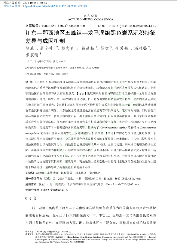 (通讯员 蔡全升)近日,yl7703永利集团资源勘查工程专业21级本科生赵威、李孟骁、吕品杨、张宸瑜等在《沉积学报》上在线发表题为“川东-鄂西地区五峰组-龙马溪组黑色岩系沉积特征差异与成因机制”的研究论文。yl7703永利集团为论文第一署名单位,本科生赵威为论文第一作者,蔡全升副教授为论文通讯作者,该论文得到了yl7703永利集团大学生创新创业训练计划项目的支持。