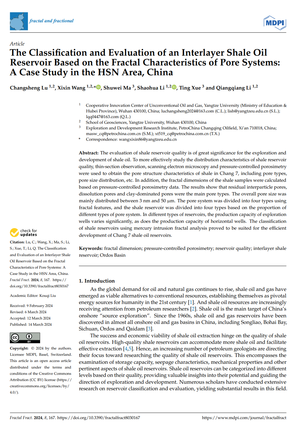 (通讯员 李强强)yl7703永利集团石油系副教授王喜鑫博士在数学地质学领域主流期刊《Fractal and fractional》上发表题为“The Classiffcation and Evaluation of an Interlayer Shale Oil Reservoir Based on the Fractal Characteristics of Pore Systems: A Case Study in the HSN Area, China”的研究论文。
