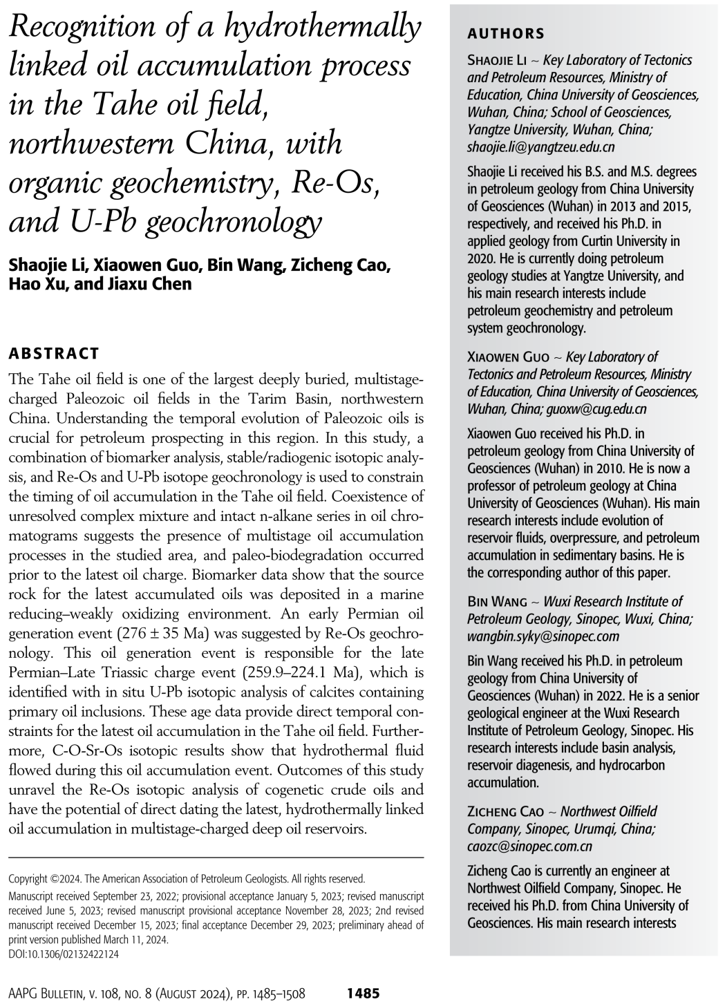 yl7703永利集团石油系李劭杰博士在石油地质学领域主流期刊《AAPG Bulletin》上发表题为“Recognition of a hydrothermallylinked oil accumulation processin the Tahe oil field,northwestern China, withorganic geochemistry, Re-Os,and U-Pb geochronology”的研究论文。