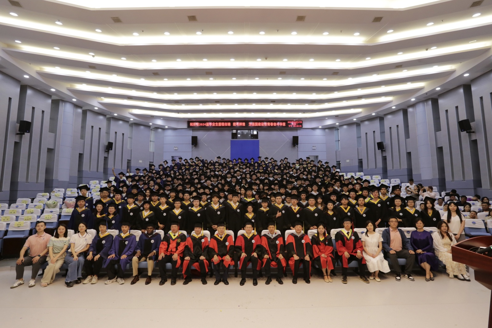 伴随着热烈的掌声,导师代表依次上台就坐。台下300多名毕业生身着学位服,神采奕奕,眼神中满载着对未来的憧憬。授予仪式正式开始,由胡忠贵副院长宣读学位授予文件,江山副院长为同学们正冠,朱光有院长为每位获得学位的同学颁发学位证书,拨穗并合影留念。毕业生以自豪和激动的心情接过学位证书。这薄薄的一纸证书,承载着同学们数年如一日的努力和坚持。整场仪式在庄重而温馨的氛围中圆满完成。