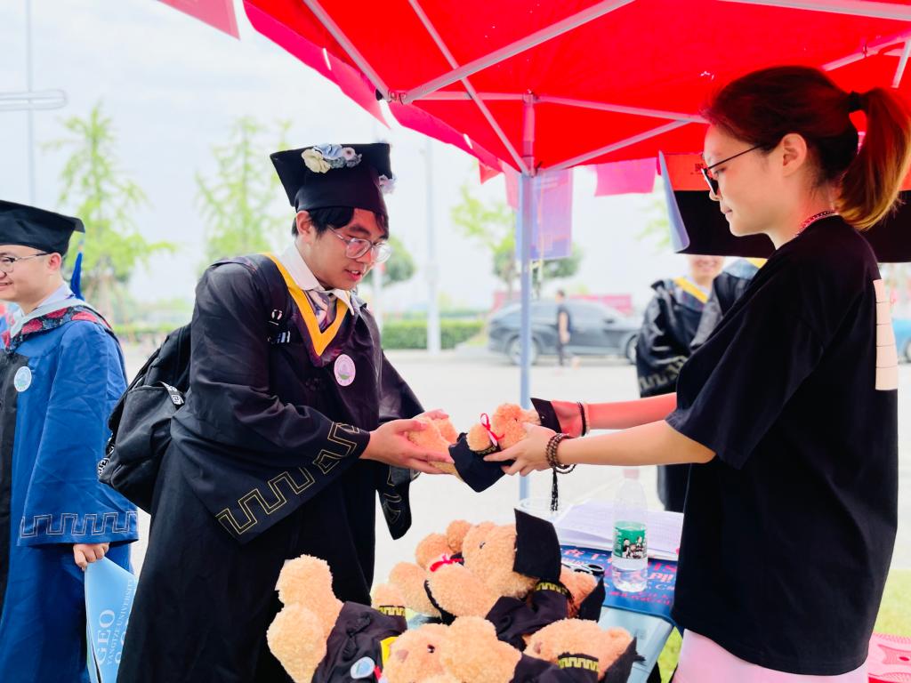 会场外,学院精心组织毕业生感恩礼活动,同学们填写问卷,写下对母校的美好祝愿和深情感谢,一个个身着学士袍的小熊玩偶、一张张我院学生原创设计的鼠标垫、印有学院元素的帆布包,寄托着学院对毕业生“前程似锦,一路生花”的殷切期盼。