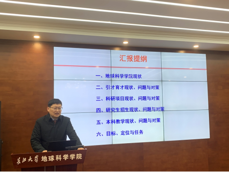在听取工作汇报后,刘勇胜对我院取得的成绩表示了肯定,对班子成员的整体工作状态和团队凝聚力给与赞扬,回应了学院发展建设中存在的主要困难和问题。他表示,地科学院历史悠久,基础较好,希望学院领导班子一是要有危机意识,以万变应万变,要进一步找准发展定位,适应新时代发展要求;二是要明确发展目标,加强学科建设,高度重视国家基金申报工作,要为实现学校基金倍增计划做出地科贡献;三是要加大高水平人才引育工作,做到激励与约束并重,加快高质量科研成果培育,促进高水平团队建设;四是要牢牢树立培养拔尖人才与国际化人才的思想,要鼓励老师走进学生,多与学生谈心,要快速推进地质资源与地质工程学科建设;五是要加快平台建设提档升级,重新谋划重点研究方向,争取突破一批学科前沿研究成果和关键技术领域。
