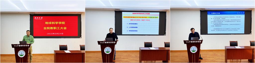会议第二阶段为各系(中心)针对2022年目标管理责任制任务的完成情况开展述职。石油系主任陈轩、地质系主任胡忠贵、地信系主任李功权,地科系主任江山、实验中心副主任高达依次上台讲成绩、晒数据、谈思路,对2022年度完成的重点和亮点工作进行了汇报展示,并对工作中存在的问题和当前形势进行了分析,明确了努力的方向。