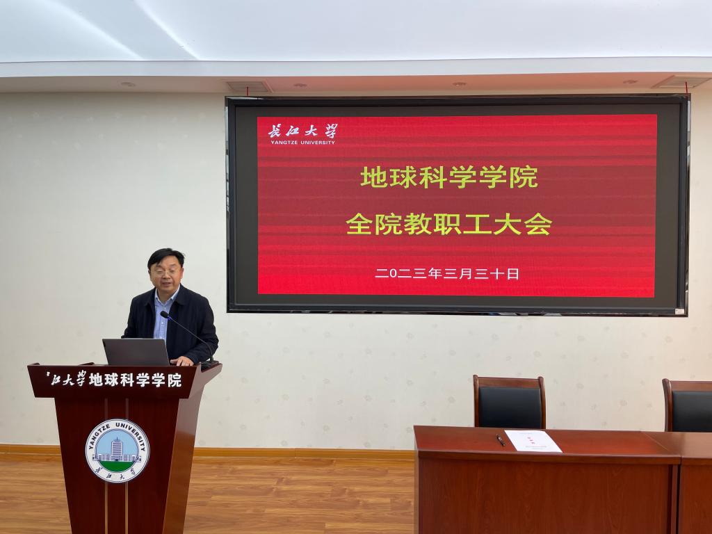 (通讯员 尚成)3月30日下午,我院在石油科技大楼C301室召开了全院教职工大会。安排和部署学院近期重点工作,各系(中心)主任对2022年度工作完成情况进行述职,并签订2023年目标任务书,会议由院长胡明毅主持。