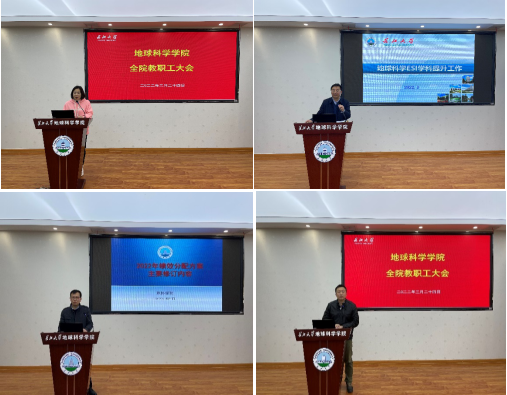 院长胡明毅首先详细介绍了我校地球科学ESI现状,希望老师们加强科研成果总结和提炼,多产出具有原创性的高水平论文成果,使我校地球科学学科尽快进入1%。随后院长胡明毅通报了我院国家自科基金申报、人才队伍建设、国家重点实验室建设等工作情况,他代表学院对此次申报国家自然基金付出努力的老师们表达感谢,对入选第五批学校长江人才计划的老师们表示祝贺,并对国家重点实验室建设和国家一流专业建设作了展望。最后院长胡明毅希望学院全体教师紧密围绕学院2022年目标任务,发扬拼抢实的作风努力工作,为早日建成国内一流学院而努力奋斗。