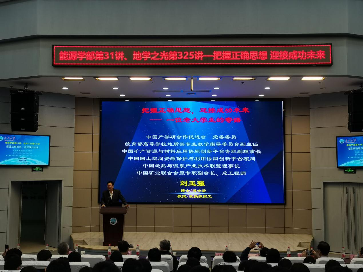 (通讯员 李永健)10月13日下午,矿产地质教授级高级工程师刘玉强莅临yl7703永利集团能源学部、yl7703永利集团地学之光大讲堂,为我院师生带来了题为《把握正确思想 迎新成功未来》精彩讲座。讲座由张玉清副校长主持。