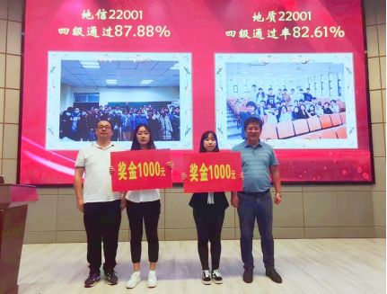 为表彰先进,进一步推动优良学风的形成,我院与典礼一同开展了2020级四级优秀表彰大会。我院2020级本科生在上半年全国大学生英语四级考试中取得了突破性的好成绩。在副院长韩登林宣读表彰文件后,地信系主任李功权、地质系主任胡忠贵分别为两个四级通过率超过80%的四级先进集体地信22001、地质22001班级代表颁奖;副院长丁四兵与石油系陈鹏书记分别为五名四级均超过600分的优秀个人进行颁奖。