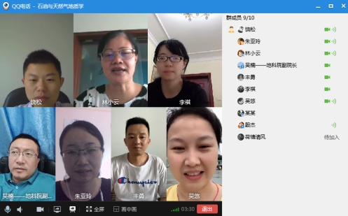 (通讯员 饶松)7月11日下午,我院“石油与天然气地质学”课程组利用QQ视频会议组织召开了课程建设专题研讨会,《石油与天然气地质学》、《油气地球化学》和《石油地质专业英语》全体任课教师林小云、王振奇、刘建、吴楠、饶松、丰勇、吴悠、朱亚玲、李祺和殷杰共10人参加了研讨会,会议由课程组负责人林小云教授主持。