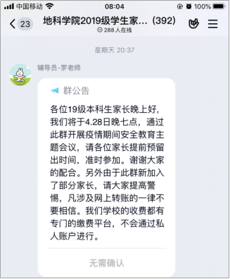 (通讯员 郭霖)为进一步做好常态化疫情防控下学生教育管理工作,使家校联动形成全力,共同保障学生防疫期间居家学习安全。我院于4月27日~29日分年级召开“疫情期间居家安全教育”专题会议,会议由各年级辅导员主持,学生及家长通过各年级家长QQ群参加,学工办全体老师参会。