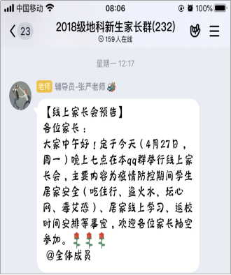 线上专题会议开始前,各年级辅导员先以班级为单位,进行点名和签到,确保所有学生家长参加,无遗漏,专题会议从三个方面展开。一是安全教育。虽然国内疫情防控持续向好,但形势依然严峻,学院高度重视疫情防控工作,坚持每天对学生进行打卡,要求学生汇报健康和位置信息;每天值班老师对学生健康情况进行统计,确保学生无异常;对学生家长确诊情况进行调查,对确诊家庭予以关怀;开展系列安全教育活动,如“抗击疫情,我能做什么”主题班会、国家安全教育日活动、大学消防安全公开课等。还以大量实例加图片的形式,针对大学生居家安全“吃住行、盗火水、坛心网、毒艾恐”12个方面进行了详细教育。二是居家学习。各年级辅导员先向家长们展示了我校网上授课的基本情况,再从家长、老师、学生三个层面剖析了大家对网课的态度,希望同学们自觉、自律,怀着对自己负责,对家庭负责,对未来负责的态度,珍惜来之不易的网课条件,认真上好每一堂网课。三是返校时间。针对同学和家长们最关心的话题,各年级辅导员反复强调,返校时间一定要等待学校的正式通知,切莫违反学校规定私自返校。