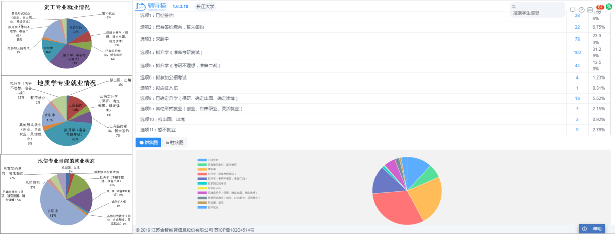 为更好开展系列工作,学院前期做足了准备。各个专业分毕业、就业两步走,一放面年级辅导员通过与教学办、教务处对接,了解存在毕业困难学生的具体情况,包含涉及欠学分重修学生与欠学分补修的情况;对重修人数比较集中的课程,选课数量较多,因学业负担较重可能毕业有困难的学生重点标注。另一方面,就业专干通过辅导猫平台对331名本科生及157名研究生进行了就业意向调查,调查范围涉及学生当前的就业状态、学生希望求职时的专业对口情况、学生倾向的企业性质、学生参加线上招聘会的主要渠道、学生倾向的就业地区、学生期望的薪资等6个部分,并对未就业的学生情况进行摸排。