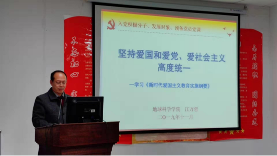 会议伊始,江万哲书记作主题为《坚持爱国和爱党、爱社会主义高度统一》的党课报告。“爱国主义是中华儿女最自然、最朴素的情感,是中华民族精神的核心。爱国主义的本质就是坚持爱国和爱党、爱社会主义高度统一。”江书记强调在新时代的格局下,青年人们应该胸怀新使命和新担当。结合时下社会热议的香港问题、中美贸易问题,江书记提出青年人是社会主义建设者和接班人,应当坚持在党的领导下,树立远大理想和立家国情怀,勇于担当,砥砺奋斗,为实现中华民族伟大复兴的中国梦,为推动“一带一路”建设,为构建人类命运共同体的伟大实践担负起时代和人民赋予的责任和使命,永续奋斗。