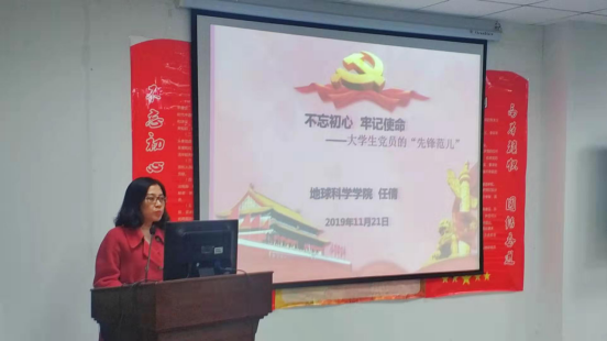 随后,任倩副书记作标题为《不忘初心、牢记使命——大学生党员的“先锋范儿”》的党课报告。任书记首先介绍了“先锋”的含义,引出学生党员如何发挥模范带头作用这一论题。从学生党员发展原则、学生党员入党流程、学生党建工作标准的角度,任书记介绍了我院学生党建工作的内容和重要性。任书记希望通过学生党员先锋模范带头作用的引导,引领我院学生从思想、学习、学生干部工作等各方面进步,带动全院同学做有理想、有道德、有文化、有纪律的“四有”新人。