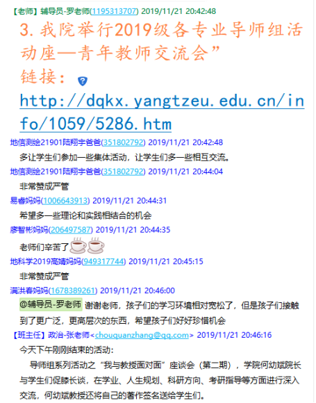 (通讯员罗小玉)11月21日晚19:30,我院在2019级学生家长群召开了19级本科生第一次线上家长会,此次家长会由年级辅导员罗小玉主持,学院党委副书记任倩、辅导员王宁、潘志远、张严、辅导员助理周寒及255名学生家长共同参与了本次线上讨论。