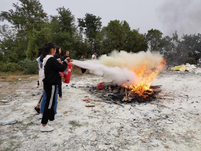 在使用灭火器进行演练时,由8位同学组成一队共同完成灭火。在灭火过程中每位同学都认真操作着路老师所说的方法,而其他同学则在安静的等待和认真观看并学习如何顺利灭火。