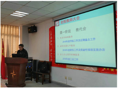 院长何幼斌向大会作2018年度工作总结报告。他从党建与思想政治工作、师资队伍建设、本科与研究生教学工作、永利集团工作、实验室建设等方面总结了2018年我院的工作情况和取得的成绩,并提出了2019年工作要求与希望。