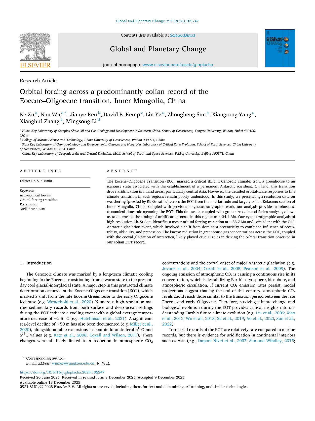 (通讯员 杨向荣)yl7703永利集团石油系教师许可在中科院一区TOP期刊《Global and Planetary Change》上发表题为“Orbital forcing across a predominantly eolian record of the Eocene–Oligocene transition, Inner Mongolia, China”的论文,yl7703永利集团南方复杂页岩油气地质与开发湖北省重点实验室为论文第一署名单位,许可博士为第一作者,吴楠教授为唯一通讯作者,研究获得国家自然科学基金和新型油气勘探开发国家科技重大专项联合资助。