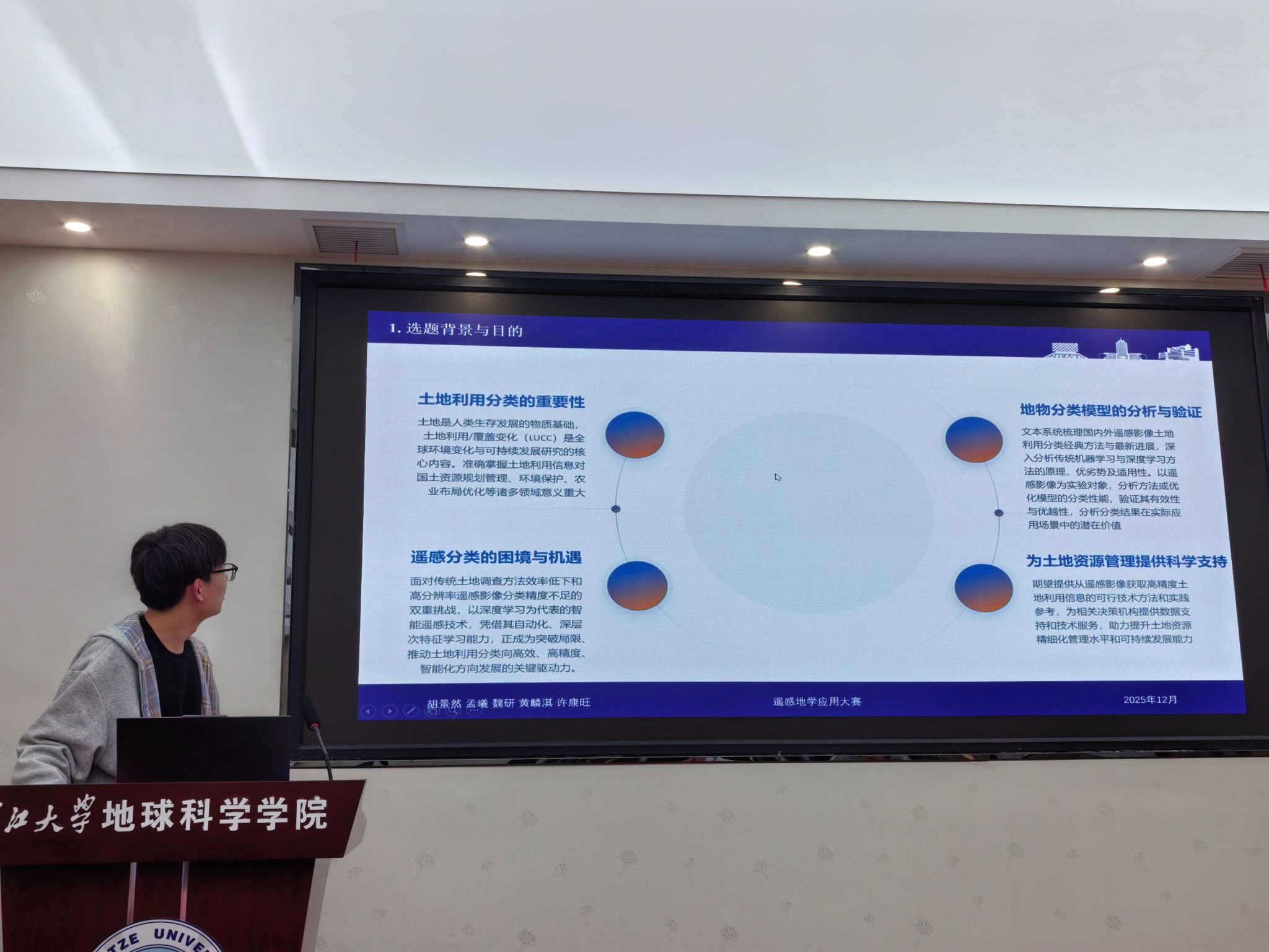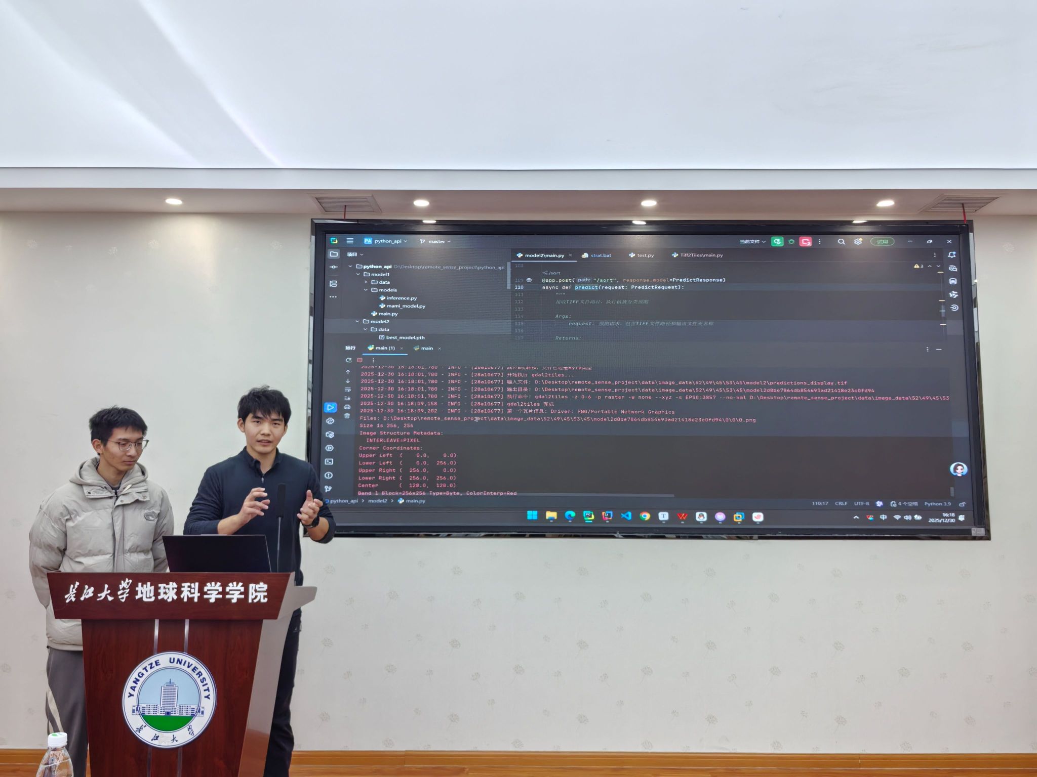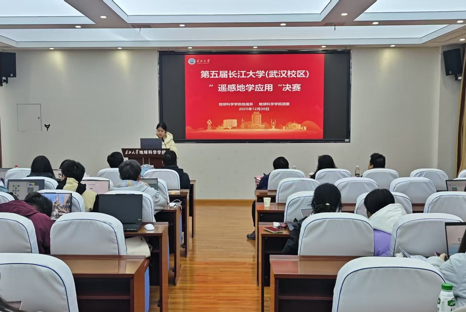 (通讯员 高煜九 杨潘睿达)为激发学生学习兴趣,提升专业素养,推动专业知识与地学实践深度融合,我院于12月24日至30日成功举办第五届GIS应用能力大赛“遥感地学应用”赛道比赛。本次比赛面向全院本科生,23级地信专业全体同学参与,赛事分为初赛和决赛两个阶段。 在初赛阶段,共有17支队伍围绕大赛选题,通过编程实现、专题制图与分析报告等形式提交作品。经评委严格评审,9支队伍脱颖而出,晋级决赛。12月30日下午,决赛答辩在石油科技大楼C301教室举行。副院长胡忠贵老师,地信系刘远刚、井然、高贤君、魏薇、张方利等老师担任评委。 大赛选题聚焦行业前沿与社会需求,涵盖城市热岛效应监测、植被变化检测、湖泊水体提取、土地利用分类、建筑物识别及SAR图像舰船检测等方向,鼓励学生运用遥感技术与编程手段解决实际问题。各参赛队伍依次进行汇报,从选题意义、数据来源、技术路线、处理流程、成果总结等方面全方位展示作品。同学们将理论知识与实践相结合,体现出良好的分析能力与创新思维。每队汇报后,评委老师围绕作品科学性、创新性及实用性进行提问与点评,现场交流热烈。 全部队伍展示完毕后,刘远刚老师作总结点评。他对同学们展现出的专业基础、协作精神和创新意识给予充分肯定,并鼓励大家在今后的学习中进一步夯实理论、加强实践,主动对接国家战略与行业需要,以专业能力服务社会,践行地科学子的使命担当。 经综合评定,本次大赛共评出一等奖1项、二等奖3项、三等奖5项。 我院“遥感地学应用”大赛已连续举办五届,是“地学之光杯”系列学科竞赛的重要组成部分。大赛以遥感类课程为依托,由地信系与学院分团委共同组织,持续为学生搭建以赛促学、以赛促练的实践平台,有效助推我院实践教学与人才培养质量不断提升。