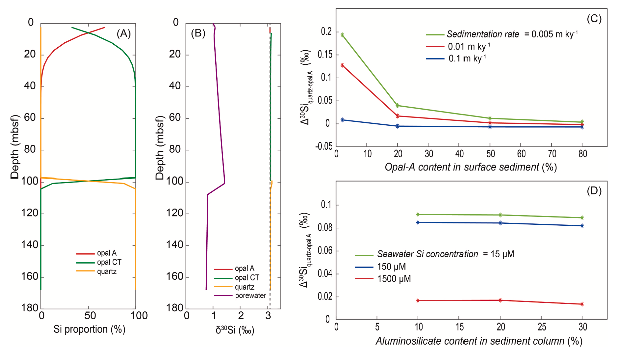 同时,该研究构建了硅同位素在成岩过程中的演化模型,模型显示,由于沉积物中的硅含量通常远超于孔隙水中的硅含量,成岩流体对富硅沉积物的硅同位素改造作用较小,全岩硅同位素依然可以作为保存沉积物和古海洋的有效记录。