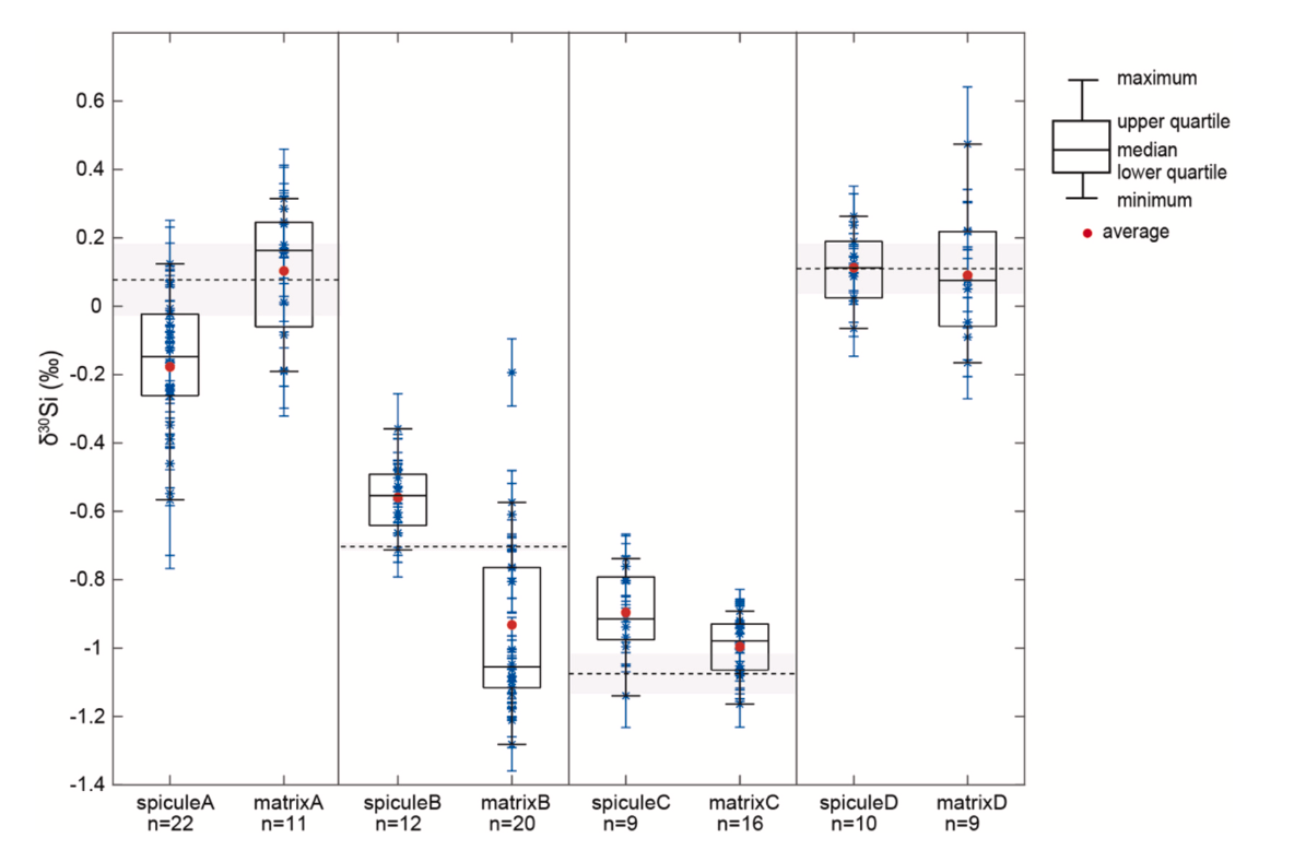 图2 海绵骨针和基质的原位硅同位素的均一化