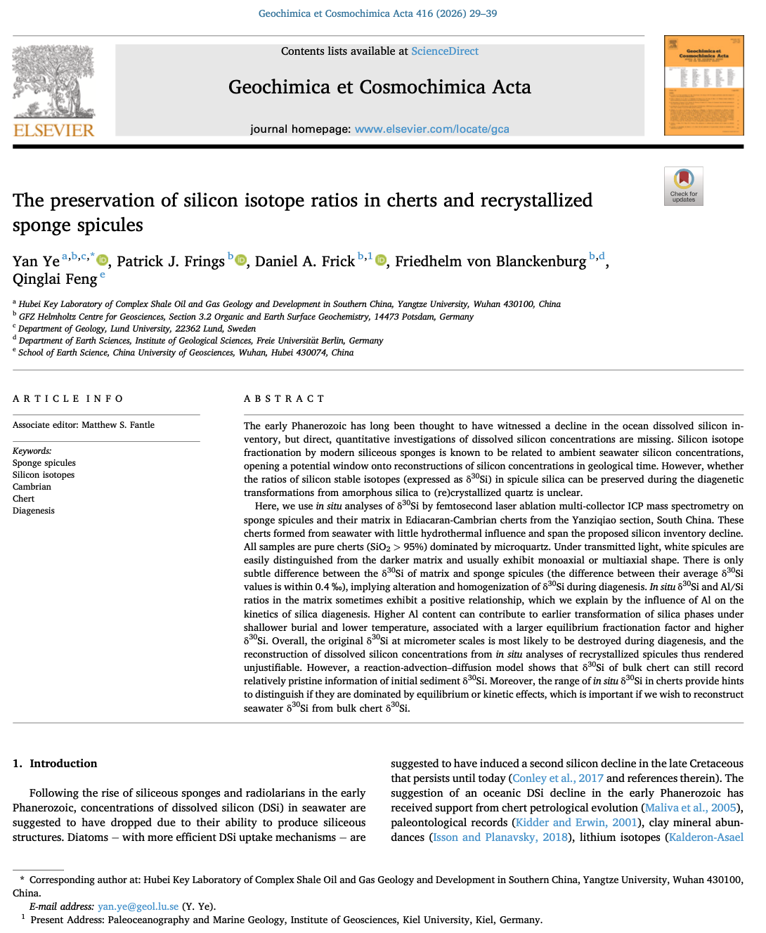 (通讯员 陈粲)yl7703永利集团特任副教授叶炎以第一作者身份,近期在地球科学领域国际权威期刊《Geochimica et Cosmochimica Acta》上发表了题为“The preservation of silicon isotope ratios in cherts and recrystallized sponge spicules”的研究论文。yl7703永利集团为论文第一署名单位。