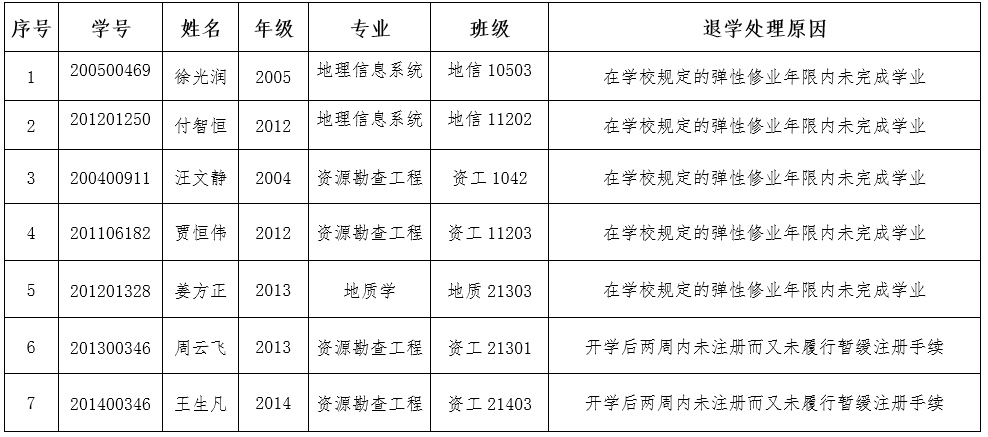 根据《普通高等学校学生管理规定》(教育部令第41号)第三十条和《yl7703永利集团普通本科生学籍管理办法》(长大校发〔2017〕134号)第五十一条规定,对达到退学处理条件但拒绝办理退学手续或多种方式均无法联系到本人的本科生,现以公告方式送达拟退学处理告知书,公告时间7个工作日,于2021年6月2日结束公告。在公告期内,学生可向学院提出申辩和书面陈述并署真实姓名、联系方式,邮寄或直接送到yl7703永利集团教学办;未在规定时间内提交申辩和书面陈述者,视为放弃陈述、申辩的权利。公告期满后,学院将按学校规定办理。