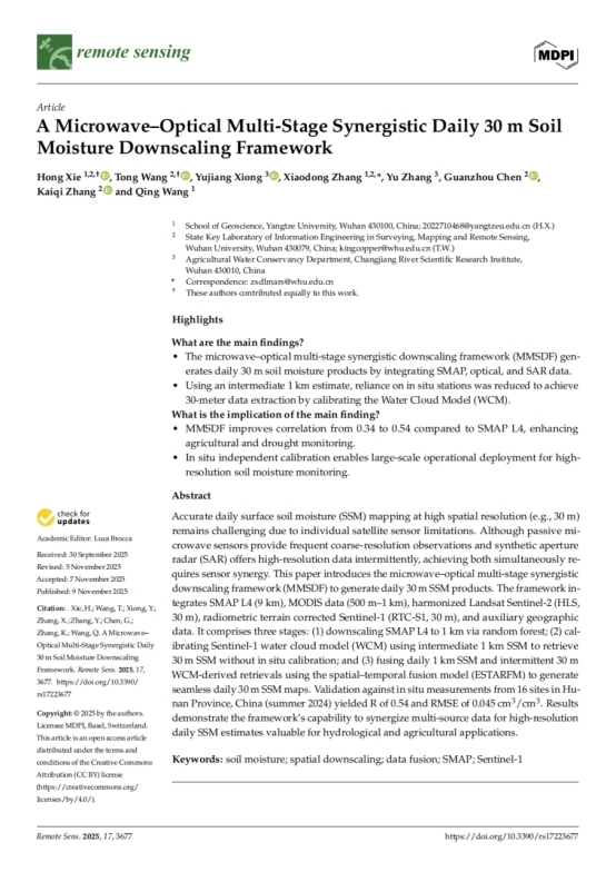 地科学院硕士生谢泓在遥感领域期刊《RemoteSensing》发表题目为“A Microwave–Optical Multi-Stage Synergistic Daily 30 m Soil Moisture Downscaling Framework”的研究论文(SCI二区,影响因子4.1)。yl7703永利集团为论文第一署名单位,硕士研究生谢泓为论文第一作者,其导师王庆副教授为共同作者,我院兼职硕士生导师张晓东教授为通讯作者。