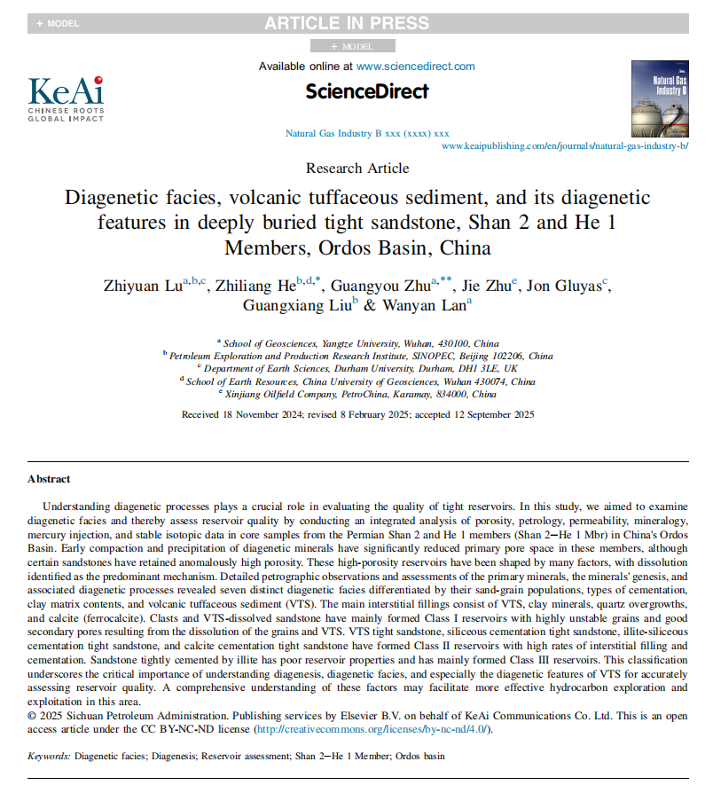 鄂尔多斯盆地是中国重要的致密气产区,上古生界山2段与盒1段是该区最主要的致密砂岩气储层。尽管早期压实和成岩矿物的沉淀显著降低了原生孔隙,部分砂岩仍保留了异常高孔隙度。为深入评价储层质量,来自yl7703永利集团深层与非常规团队、中国石化石油勘探开发研究院及杜伦大学等机构的联合研究团队,围绕山2-盒1段致密砂岩的成岩相类型、火山凝灰质沉积(VTS)及其成岩特征展开系统研究,在Natural Gas Industry B(主编:邹才能院士,张金川教授,中科院工程技术大类2区、能源与燃料小类2区)发表Diagenetic Facies, Volcanic Tuffaceous Sediment, and Its Diagenetic Features in Deeply Buried Tight Sandstone, Shan 2 and He 1 Members, Ordos Basin, China(鄂尔多斯盆地山2段-盒1段深埋致密砂岩成岩相、火山凝灰质沉积物及其成岩特征),旨在揭示其对储层物性的控制机制,为该区致密气高效勘探与开发提供理论依据。