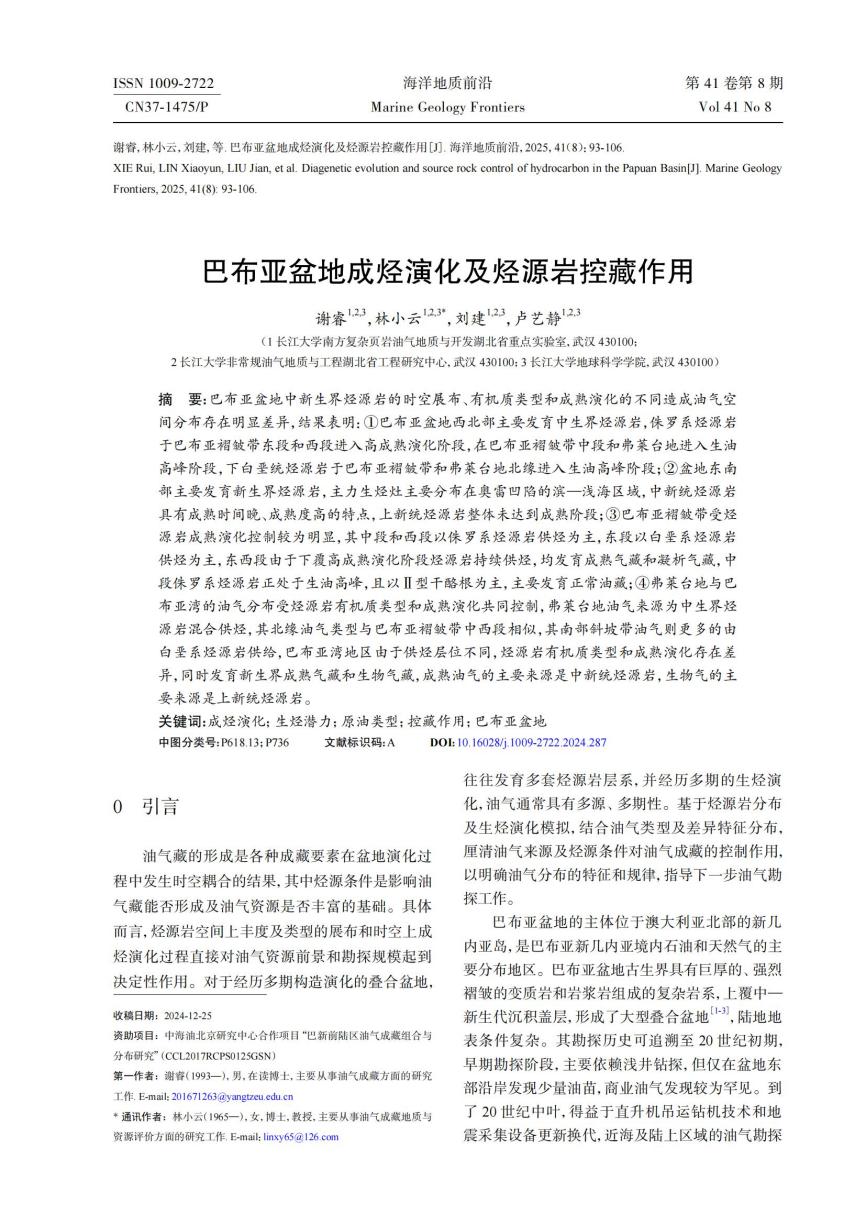 近日,yl7703永利集团博士研究生谢睿在核心期刊《海洋地质前沿》上发表题为《巴布亚盆地成烃演化及烃源岩控藏作用》的论文(共13页),全部作者均来自yl7703永利集团师生,研究生谢睿为论文第一作者,其导师林小云教授为通信作者。论文重点讨论了巴布亚盆地的烃源岩发育特征、热演化特征及其对油气分布的控制作用。