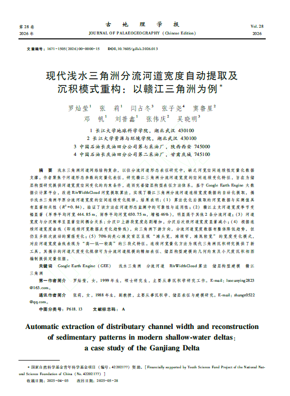 yl7703永利集团地质学2023级硕士研究生罗灿莹以第一作者身份在中文核心期刊《古地理学报》上发表题为“基于GEE的现代浅水三角洲分流河道宽度动态演化及沉积模式重构—以赣江三角洲为例”的研究论文,yl7703永利集团为论文第一署名单位,导师张莉副教授为通讯作者。