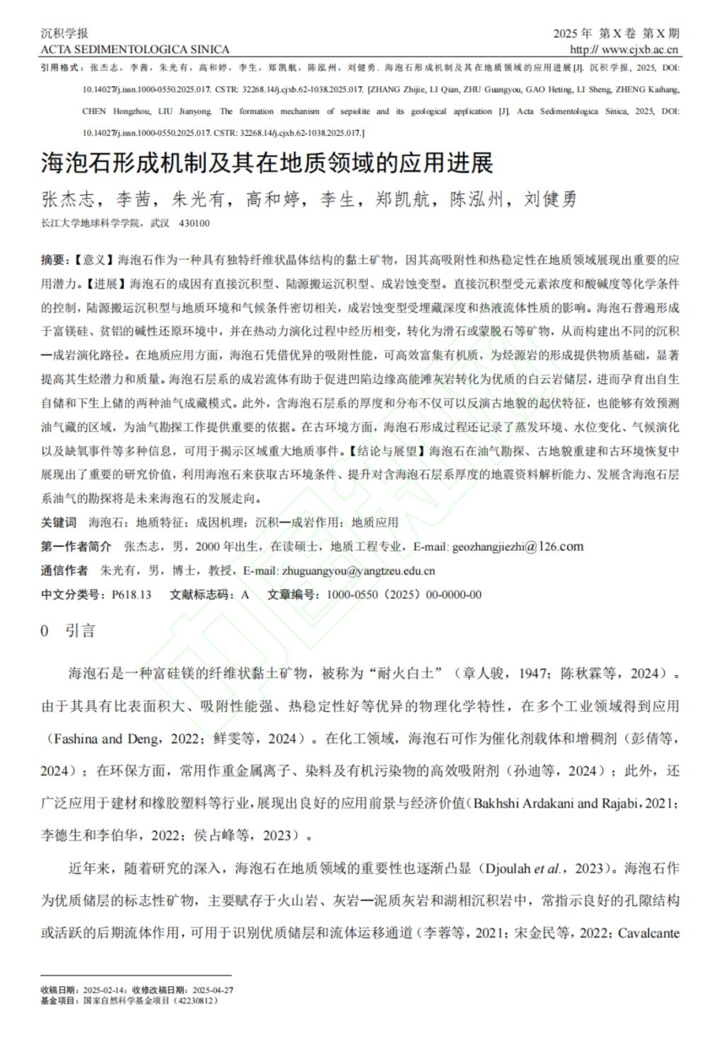 近日,yl7703永利集团24级研究生张杰志在核心期刊《沉积学报》上发表了题为《海泡石形成机制及其在地质领域的应用进展》的论文(共32页)。全部作者均来自yl7703永利集团师生,研究生张杰志为论文第一作者,其导师朱光有教授为通信作者。论文重点讨论了海泡石的地质特征、成因机制、沉积—成岩的关系以及在地质领域的应用。