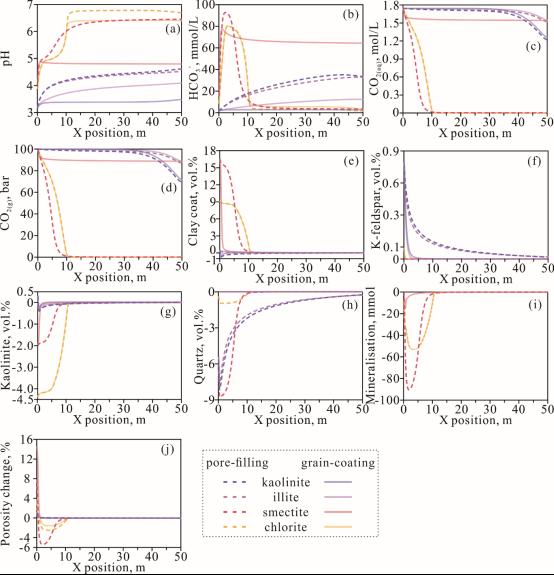 在砂岩储层地质学领域,黏土膜被认为能够显著抑制次生石英胶结物的生长(Li et al., 2025a),且近期研究表明其也可以有效降低被包裹长石颗粒的溶蚀速率、其本身也可以发生显著溶蚀(Li et al., 2025b),从而可以显著改变砂岩水-岩反应路径。由于在相似地质背景条件下,富黏土膜砂岩往往比贫黏土膜砂岩保存更高的孔隙度,因此是CO2地质封存的潜在优选目标层位;但有关黏土膜对水-CO2-岩石间化学反应的研究则较少。针对于此,采用数值模拟方法,通过对比包膜状黏土和孔隙充填状黏土的差异化学反应(图2),重点突出了黏土膜对水-CO2-岩石反应的改造。