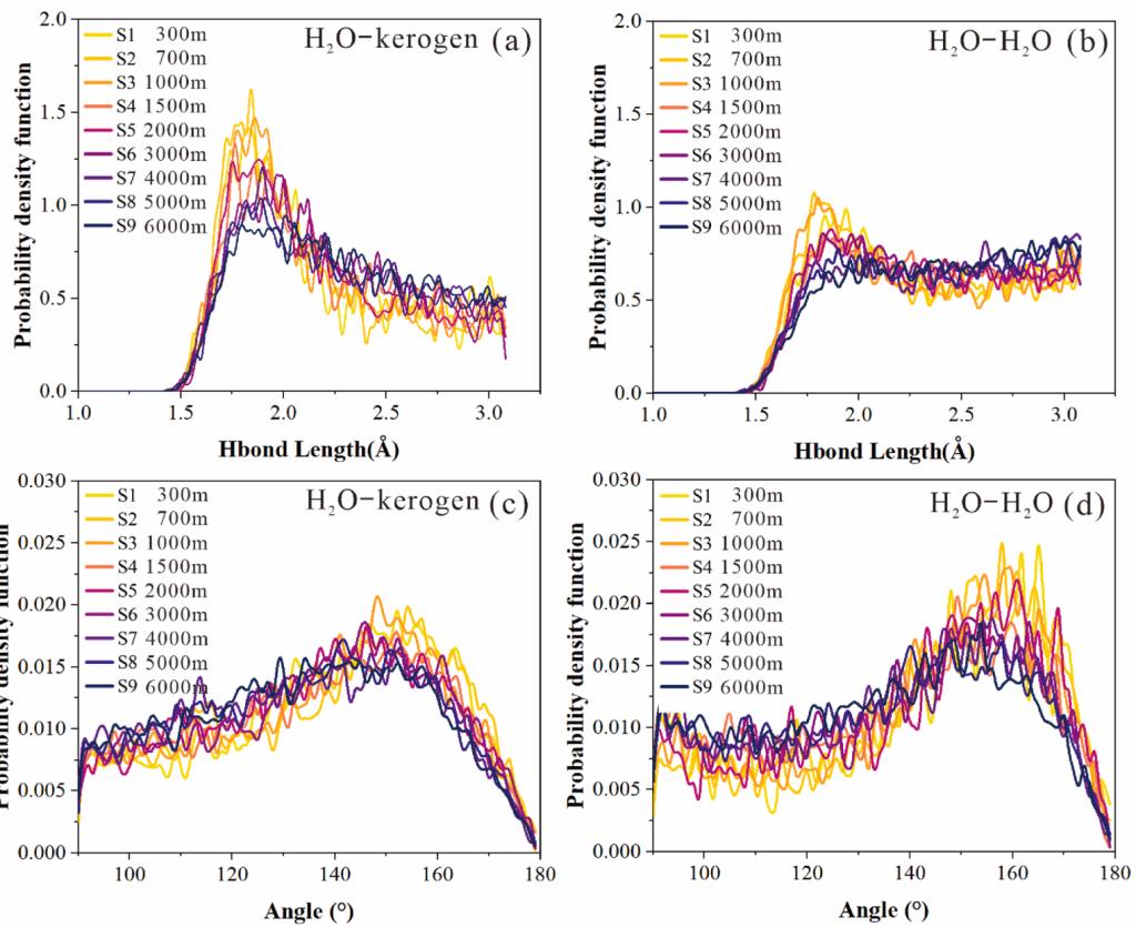 图2 不同埋藏深度下页岩水—干酪根以及水分子之间氢键长度及角度分布特征