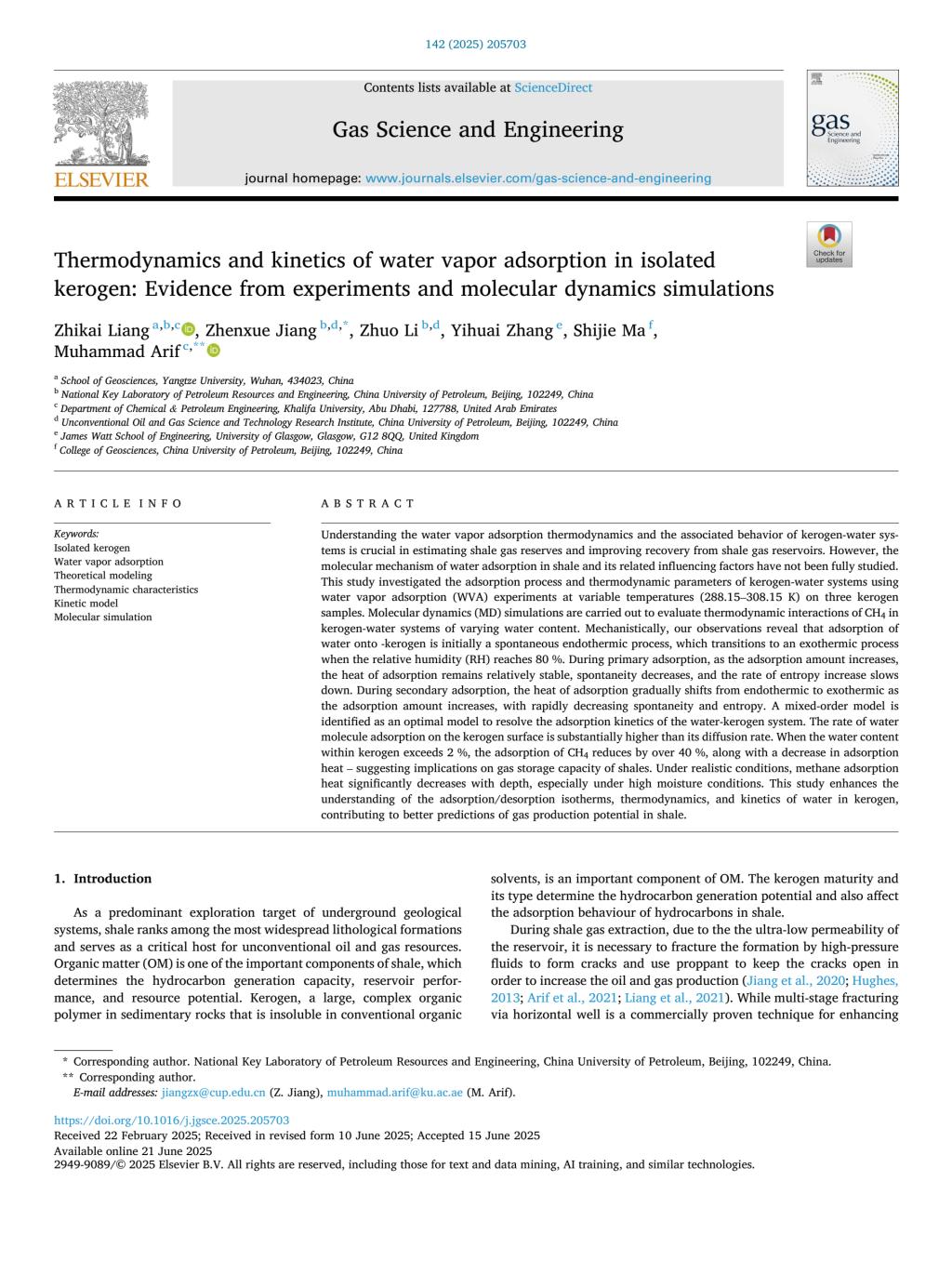yl7703永利集团石油系梁志凯特任副教授以第一作者身份在《Gas Science and Engineering》上发表题为“Thermodynamics and kinetics of water vapor adsorption in isolated kerogen: Evidence from experiments and molecular dynamics simulations”的研究论文,yl7703永利集团为论文第一署名单位。
