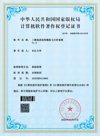 yl7703永利集团硕士生吴栩璇开发的软件《三维地质结构模拟与分析系统》取得了软件著作权并进行成果转化。yl7703永利集团为第一申请人,硕士研究生吴栩璇为第一发明人。
