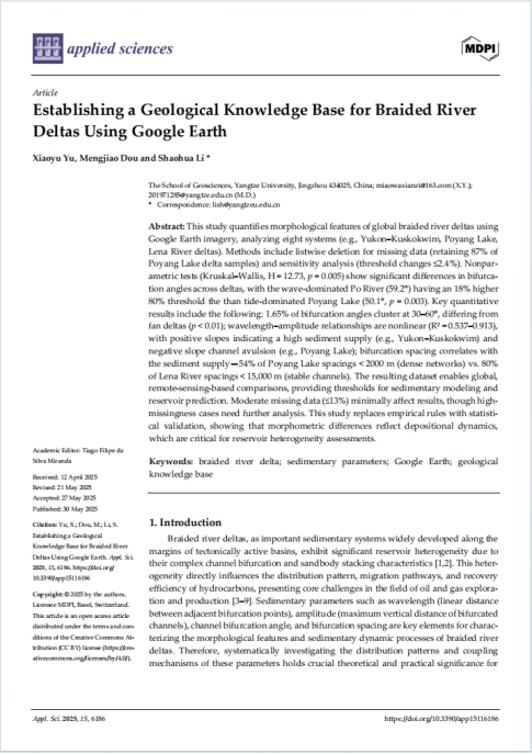 地科学院硕士研究生於筱雨在《Applied Science》上发表题为“Establishing a Geological Knowledge Base for Braided River Deltas Using Google Earth”的论文,yl7703永利集团为论文第一署名单位,研究生於筱雨为第一作者,其导师李少华教授为该论文的通讯作者。