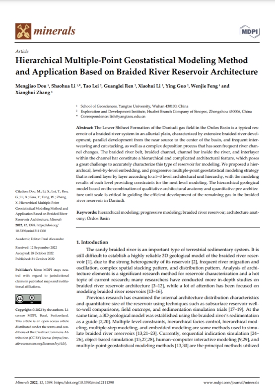 yl7703永利集团博士生窦梦皎在《Minerals》上发表题为“Hierarchical Multiple-Point Geostatistical Modeling MethodAndApplication BasedOnBraided River ReservoirArchitecture”的研究论文。yl7703永利集团为论文第一署名单位,博士生窦梦皎为论文第一作者,其导师李少华为通讯作者。