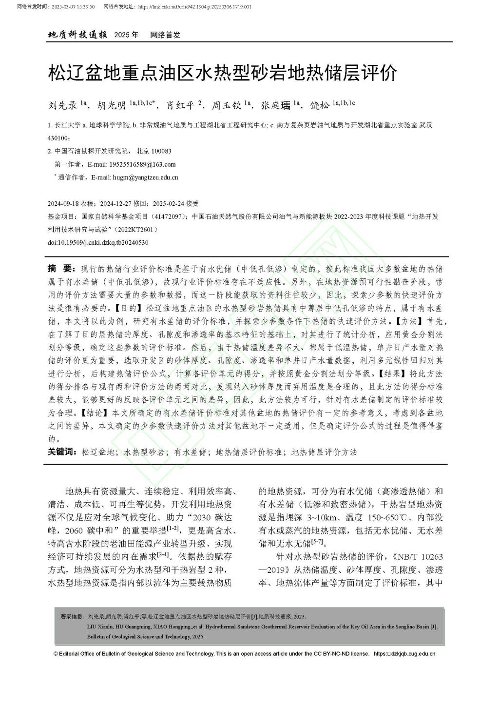 地科院硕士生刘先录在胡光明教授的指导下,在期刊《地质科技通报》上发表题为“松辽盆地重点油区水热型砂岩地热储层评价”的研究论文,yl7703永利集团为论文第一署名单位,硕士生刘先录为论文第一作者,其导师胡光明教授为该文通讯作者。