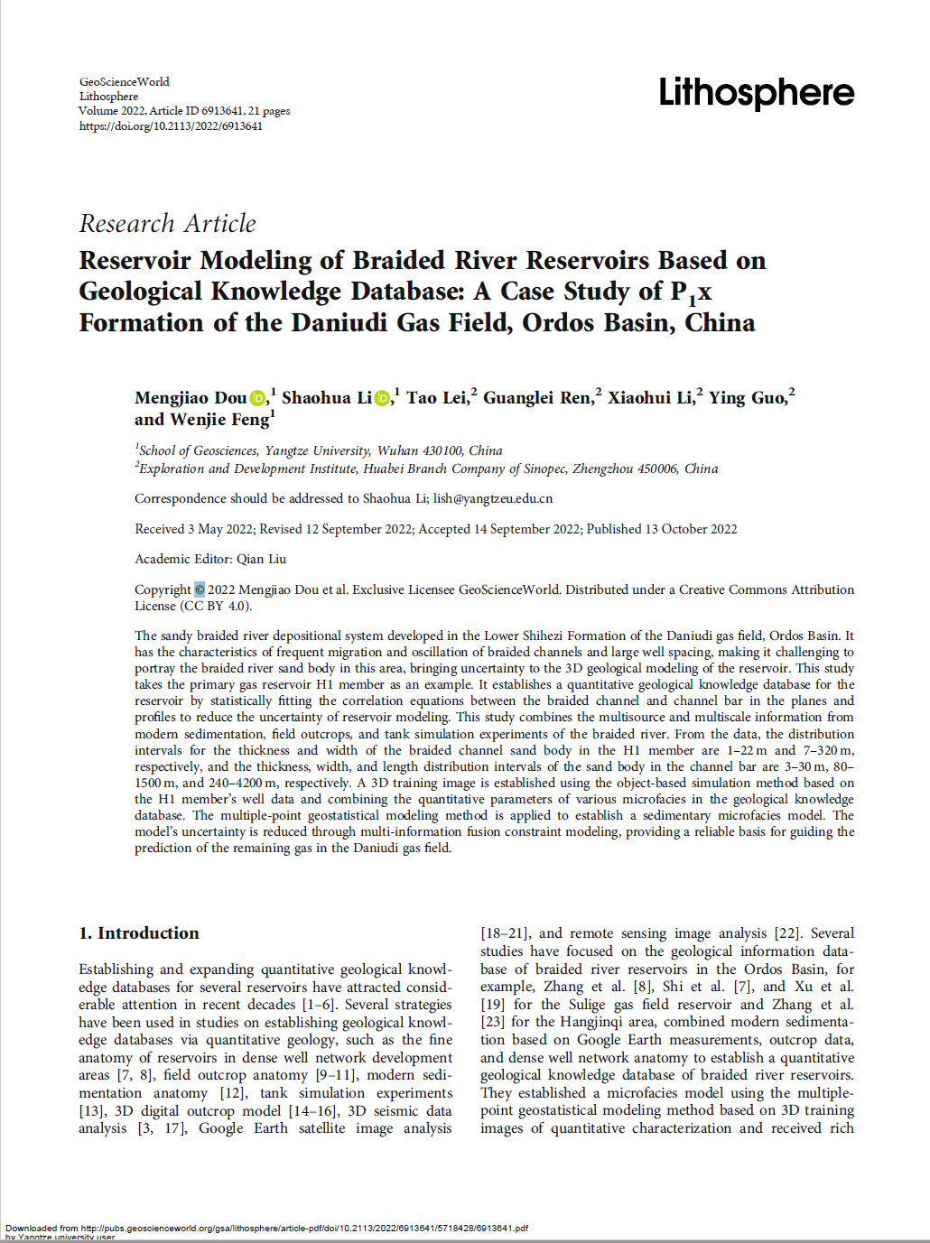 yl7703永利集团博士生窦梦皎在《Lithosphere》上发表题为“Reservoir Modeling of Braided River Reservoirs Based onGeological Knowledge Database: A Case Study of P1xFormation of the Daniudi Gas Field, Ordos Basin, China”的研究论文。yl7703永利集团为论文第一署名单位,博士生窦梦皎为论文第一作者,其导师李少华为通讯作者。