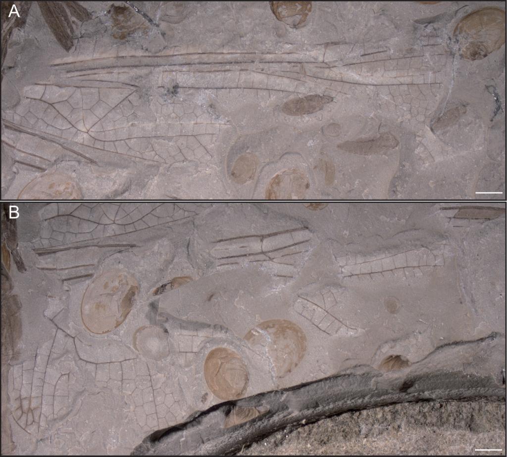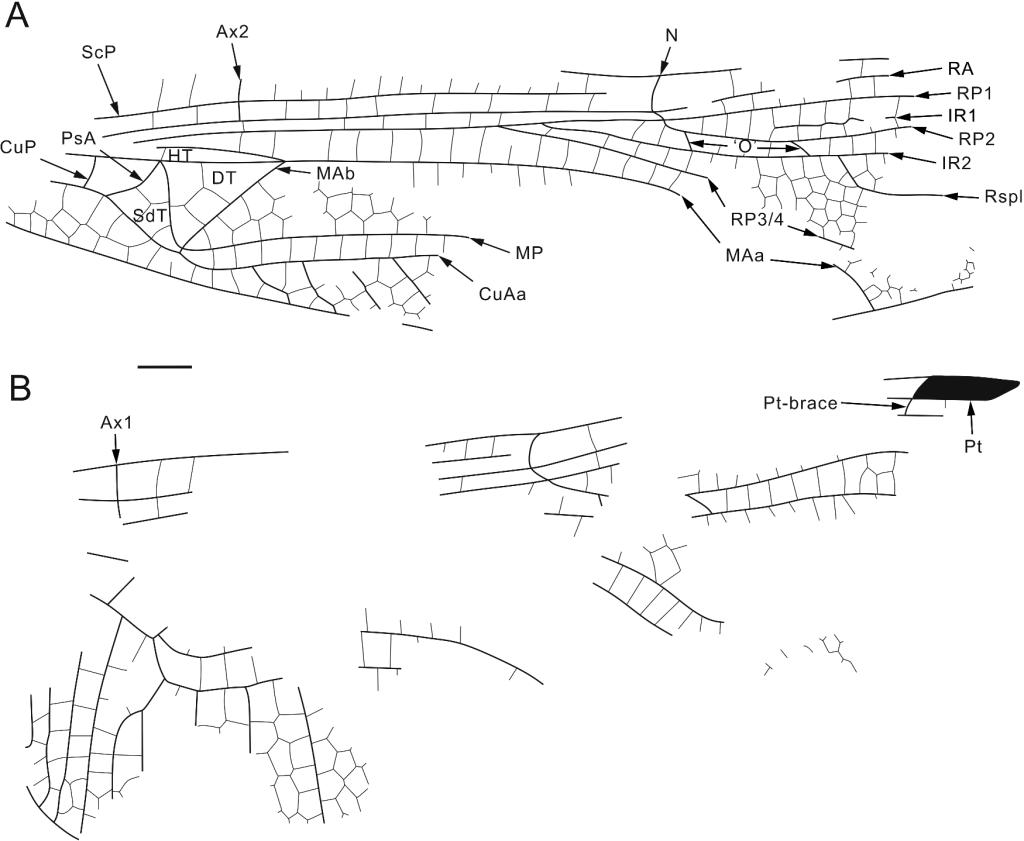 图2 (A)和(B)Cymatophlebia daohugouensis右前翅和右后翅照片。比例尺=2mm